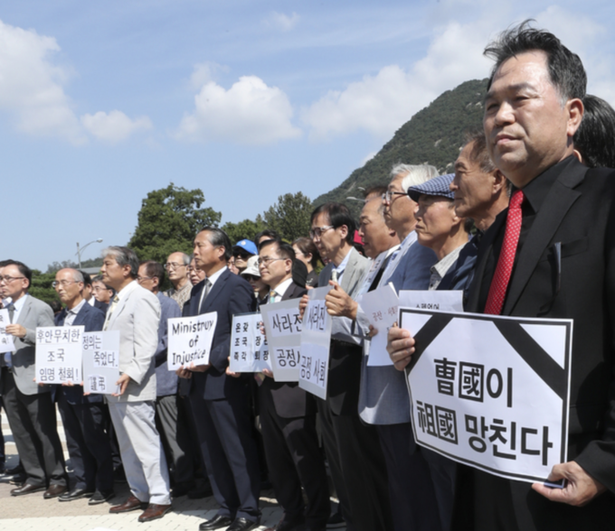 '사회정의를 바라는 전국교수 모임'(정교모)은 19일 오전 서울 종로구 청와대 분수대 앞에서 기자회견을 열고 "수많은 비리를 가지고 국민의 마음을 낙망하게 만든 조국 대신, 사회정의와 윤리를 세우며 국민적 동의를 받을 수 있는 사람을 법무부 장관으로 임명할 것을 강력히 요청한다"고 밝혔다.
