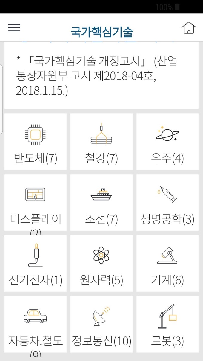 산업통상자원부가 고시(제2018-04호)한 2018년 현재 국가핵심기술은 다음과 같다.