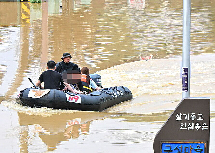 ▲ 호우경보가 내려진 19일 침수된 경남 의령군 대의면 구성마을에서 119대원들이 주민을 구조하고 있다. [뉴시스]