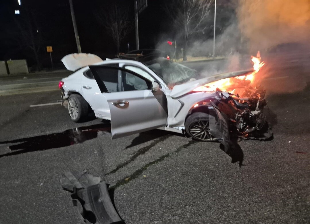 사고 차량에 타고 있던 남성 2명 가운데 조수석에 타고 있던 동승자는 차량 밖으로 튕겨 나갔고, 화재가 발생한 차량 안에 운전자는 혼절한 상태로 남아 있었다.