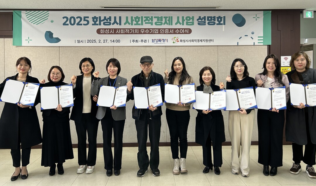 또 인증서 수여식에 이어 화성시와 화성시 사회적경제지원센터가 2025년 관내 사회적기업의 육성과 판로 개척을 위해 추진하는 40여 개 지원사업에 대한 설명도 병행됐다.