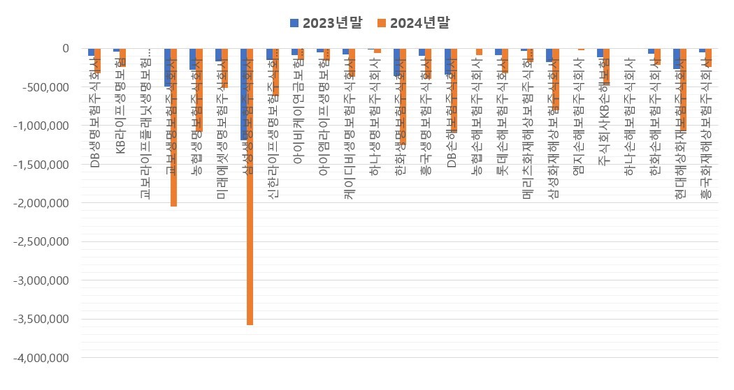 | ▲ 국내 보험사(생보 14개사, 손보 11개사)의 2023~2024년 파생상품 손실 추이. [금융감독원 금융통계정보시스템] |