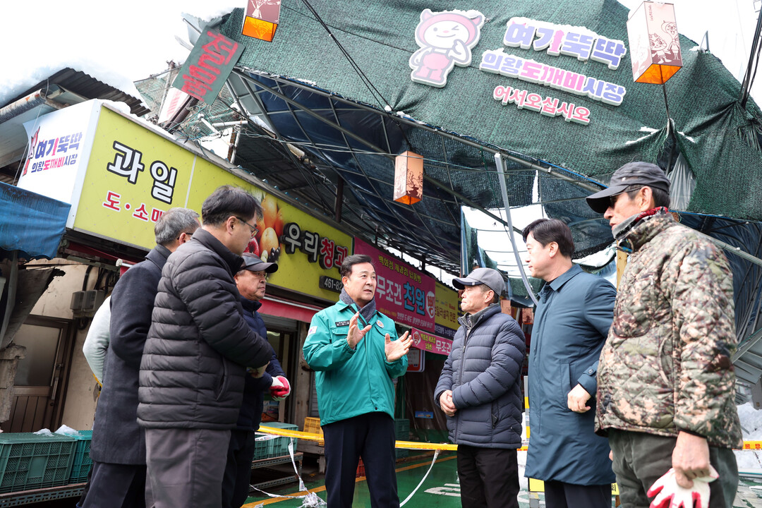 김성제 의왕시장이 28일 폭설로 천장 그늘막이 무너진 의왕도깨비시장을 찾아 현장 점검과 피해 복구 작업에 나섰다.