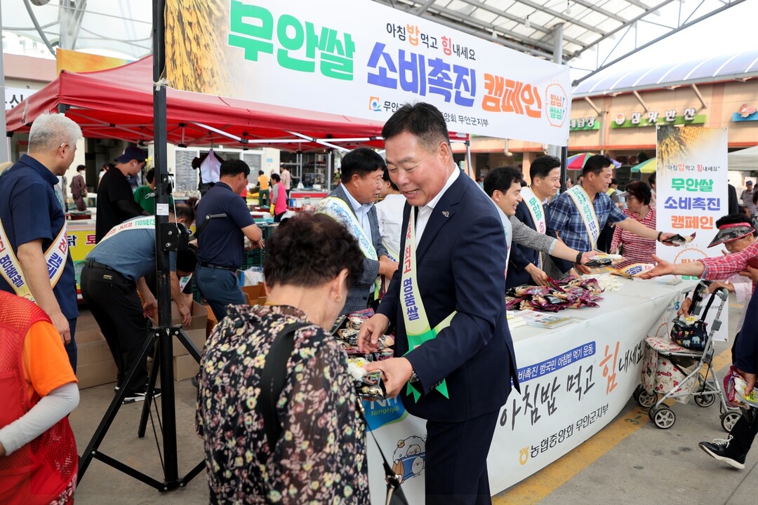 전남 무안군이 쌀 소비 위축에 따라 어려움을 겪는 농가를 돕기 위해 9일 농협무안군지부와 함께 쌀 소비 촉진 캠페인을 진행했다.