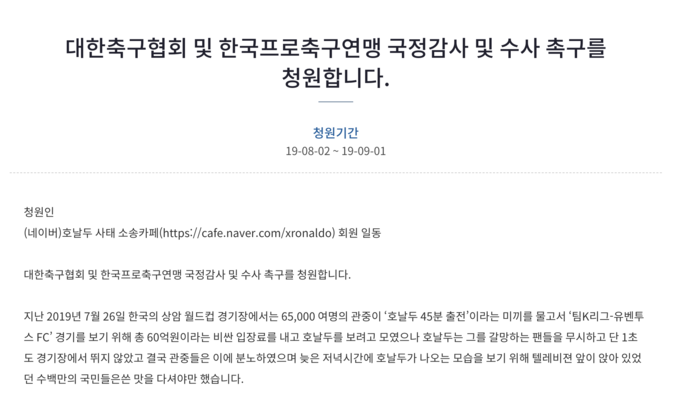 이들은 앞서 지난 2일 청와대 국민청원 게시판에 대한축구협회 및 한국프로축구연맹 국정감사와 수사 촉구 관련 청원도 시작했다.