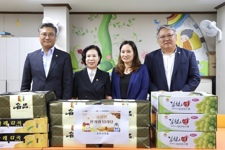 | ▲김천 샤인머스켓과 감곡 복숭아를 불우시설에 전달하고 있는 김행금 천안시장 일행.[천안시의회 제공] |