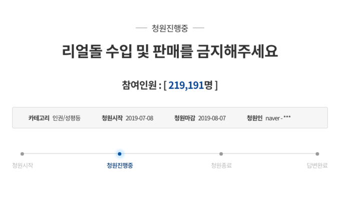 '리얼돌 수입 및 판매를 금지해주세요'라는 제목의 청원은 이날 오후 6시 현재 21만9191명의 동의를 얻었다.
