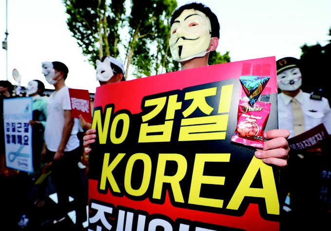 ▲ 2018년 7월 14일 서울 종로구 청와대 사랑채 앞에서 전국민주노동조합총연맹 공공운수노동조합 대한항공 직원연대지부와 아시아나항공노동조합의 공동주관으로 열린 '함께 가자 갑질 격파 문화제'에서 참가자들이 갑질 총수 퇴진 촉구 피켓을 들고 있다. [뉴시스]