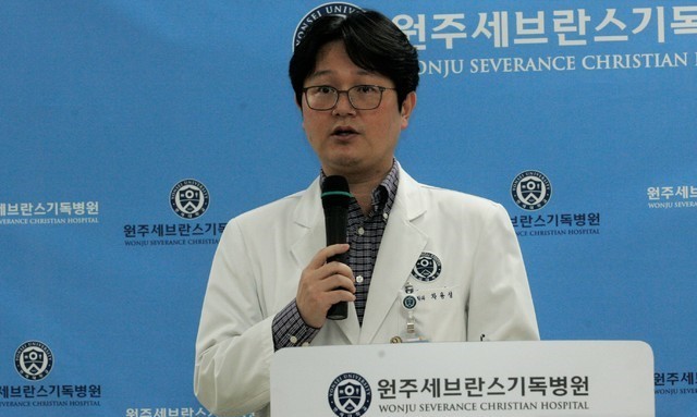 ▲ 24일 오후 강원 원주시 원주세브란스기독병원 권역외상센터 2층에서 강릉 펜션사고 피해학생 2명과 관련해 차용성 주치의가 학생들의 호전 상태에 대해 설명하고 있다. [뉴시스]