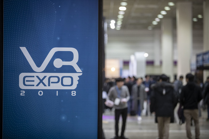 18일 오후 서울 강남구 코엑스에서 열린 VR EXPO 2018을 찾은 관람객들이 VR(Virtual Reality, 가상현실) 체험을 하고 있다.