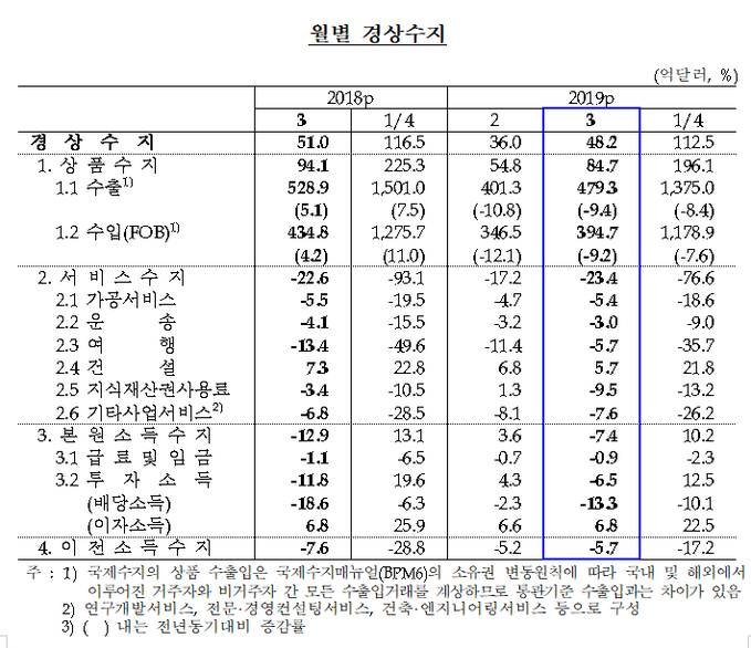 3월 경상수지는 48억 2000만 달러 흑자를 나타내 83개월 연속 흑자 행진을 이어갔다. 상품수지 악화 영향으로 흑자 폭은 작년 3월(51억 달러)보다 줄었다.