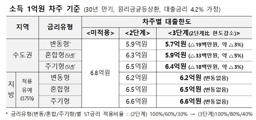 ▲ 3단계 스트레스 DSR 도입 시 소득 1억 원 차주 주택담보대출 한도 영향 분석. [금융위원회 제공]