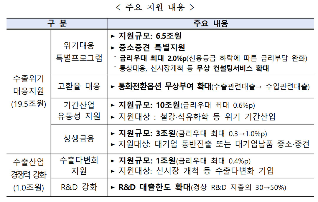 석유화학·철강 등 위기 기간산업에는 총 10조 원의 유동성을 공급하고, 대기업과 동반 해외 진출하거나 납품하는 중소·중견기업에 총 3조 원의 상생금융을 지원한다.