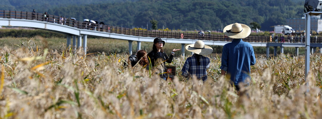 ▲ 지난 26일 관광객들이 강진만생태공원의 갈대밭 사이로 서늘한 가을을 즐기고 있다. [강진군 제공]