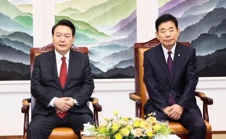 ▲ 윤석열 대통령이 지난해 10월 31일 2024년도 정부 예산안에 대한 시정 연설을 위해 국회를 찾아 김진표 국회의장과 함께 앉아 있다. [뉴시스]