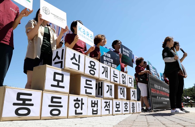 동물권보호단체 카라(KARA)와 휴메인 소사이어티 인터내셔널(HSI), 세계적 청원 사이트 Care2는 이날 오전 청와대 분수대 앞에서 기자회견을 열고 "지금 개식용 문제 해결에 관한 한 우리 앞에 놓인 유일한 길은 조속한 개식용 종식 뿐"이라며 "정부는 즉시 모든 개들이 법적으로 동등한 지위에 있음을 확인하고 이들에게 균등한 법적 보호를 적용해야 한다"고 요구했다.