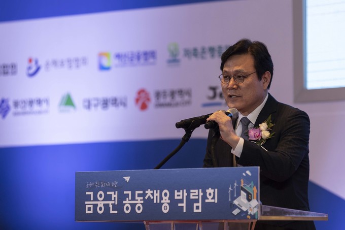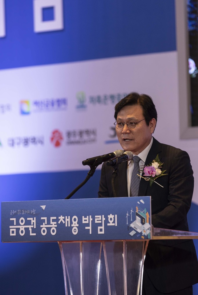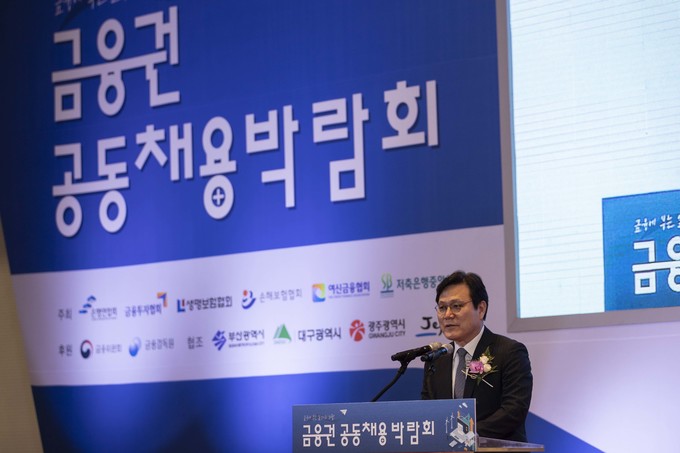 최종구 금융위원회 위원장이 27일 오후 서울 중구 동대문디자인플라자(DDP)에서 열린 금융권 공동채용박람회에 참석해 인사말을 하고 있다.