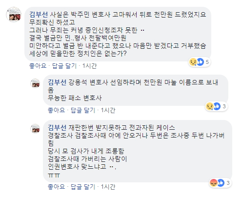 그는 이 글에 대한 댓글을 통해 "사실은 박주민 변호사 고마워서 뒤로 천만 원 드렸다"며 "무죄 확신하셨고. 그러나 무죄는커녕 증인 신청조차 못 한. 결국 벌금만 민·형사 천팔백여만 원. 미안하다고 벌금 반 내준다고 했으나 마음만 받겠다고 거부했음. 세상에 믿을만한 정치인은 없는가"라고 덧붙였다.