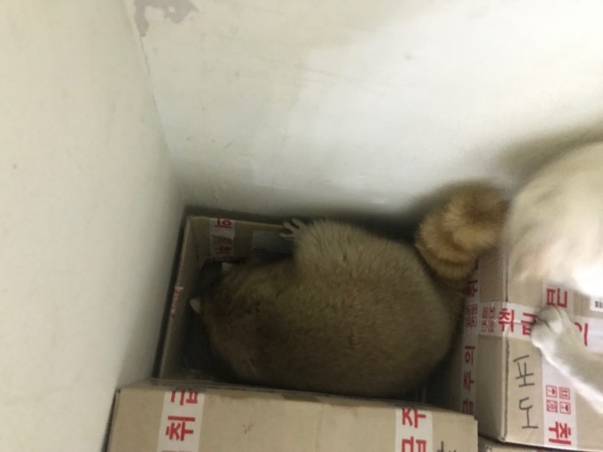 ▲ 서울 시내 한 야생동물카페에서 라쿤이 방문객들의 손길을 피해 상자 사이로 숨고 있다. [강혜영 기자]