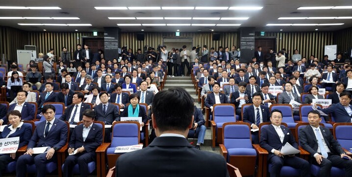 | ▲ 더불어민주당 이재명 대선 후보의 선거법 위반 사건 관련 대법원 판결에 대한 대응책을 논의하기 위해 긴급 의원총회가 열리고 있다. [뉴시스] |