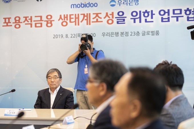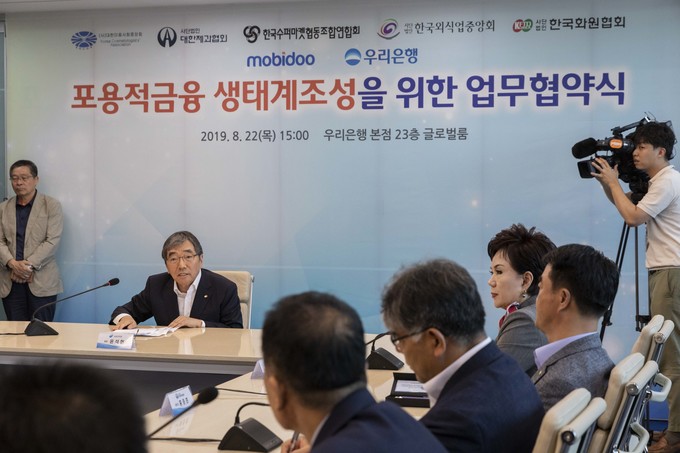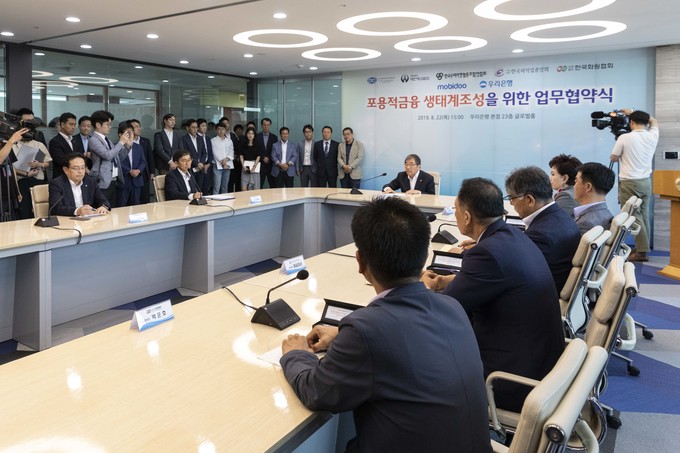 윤석헌 금융감독원장이 22일 오후 서울 중구 우리은행 본점에서 열린 '포용적금융 생태계조성을 위한 업무협약식에 참석해 발언하고 있다.