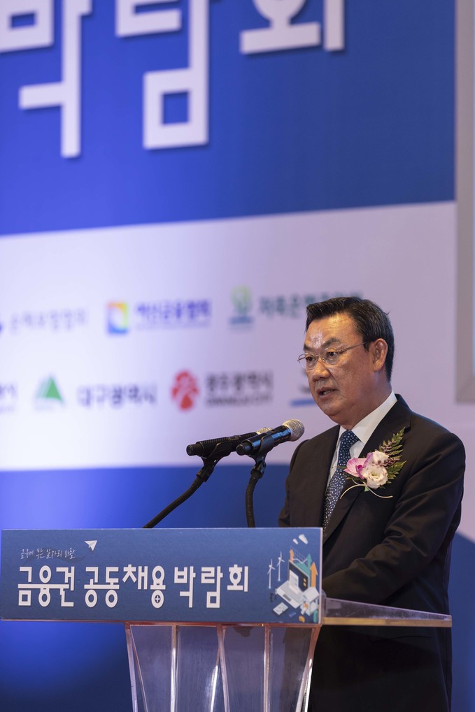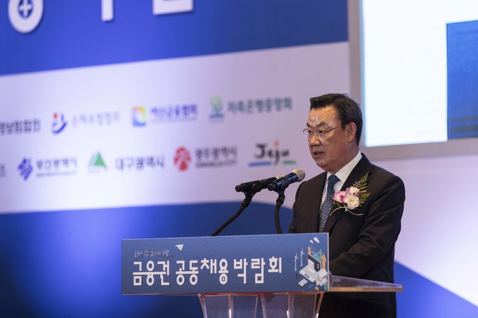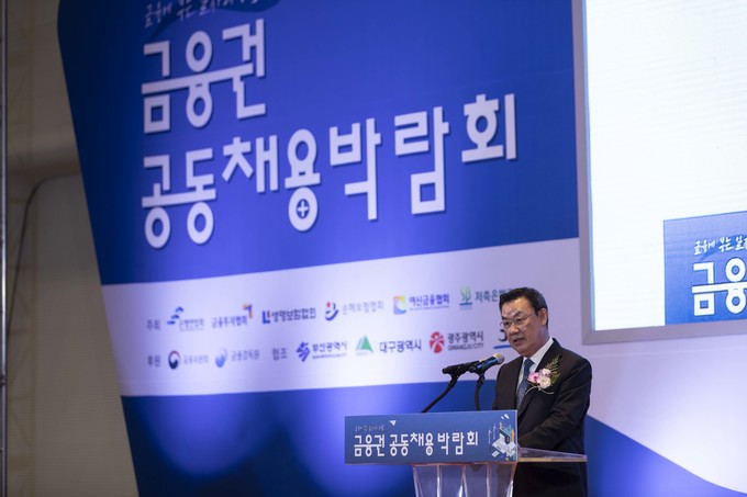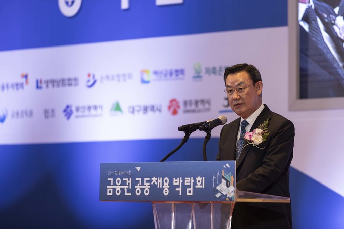 김태영 은행연합회 회장이 27일 오후 서울 중구 동대문디자인플라자(DDP)에서 열린 금융권 공동채용박람회에 참석해 인사말을 하고 있다.