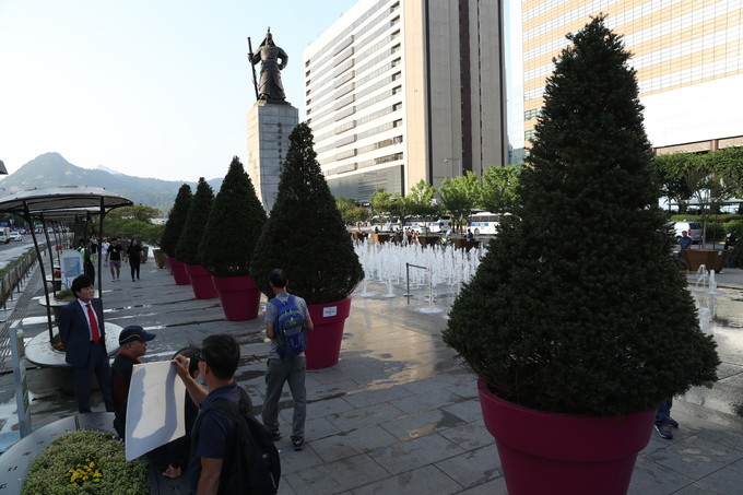 서울시에 따르면 시는 전날 오후 광화문광장 이순신장군 동상 주변 일대에 3m 간격으로 높이 약 3~4m의 대형 나무 화분 80개를 배치했다. 수종은 느티나무, 왕벚나무, 배롱나무, 소나무 등으로 알려졌다.
