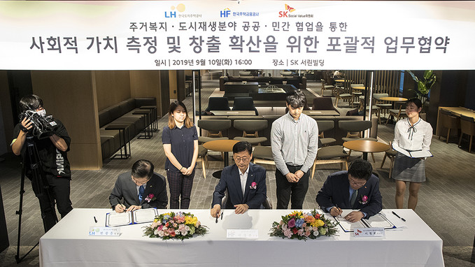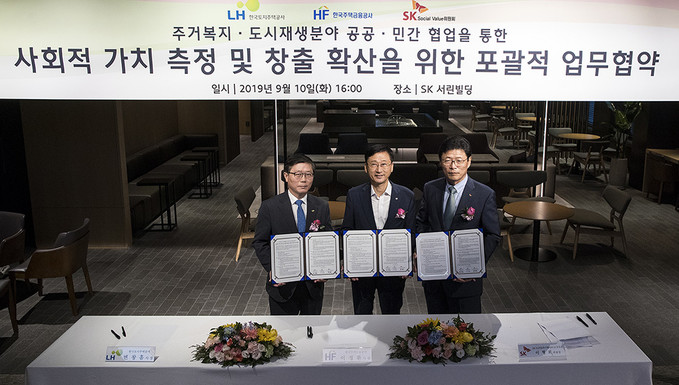 변창흠 한국토지주택공사 사장, 이정환 한국주택금융공사 사장, 이영희 SK SUPEX추구협의회 SV위원회 위원장(왼쪽부터)이 10일 오후 서울 종로구 SK서린빌딩에서 열린 '주거복지·도시재생분야 공공·민간 협업을 통한 사회적 가치 측정 및 창출 확산을 위한 포괄적 업무협약식'에서 협약서에 서명하고 있다.