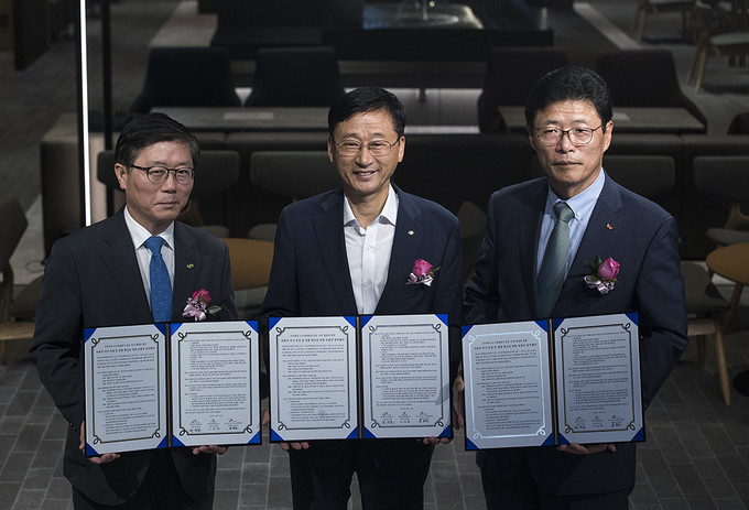 변창흠 한국토지주택공사 사장, 이정환 한국주택금융공사 사장, 이영희 SK SUPEX추구협의회 SV위원회 위원장(왼쪽부터)이 10일 오후 서울 종로구 SK서린빌딩에서 '주거복지·도시재생분야 공공·민간 협업을 통한 사회적 가치 측정 및 창출 확산을 위한 포괄적 업무협약'을 맺고 기념사진을 찍고 있다.