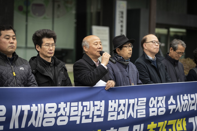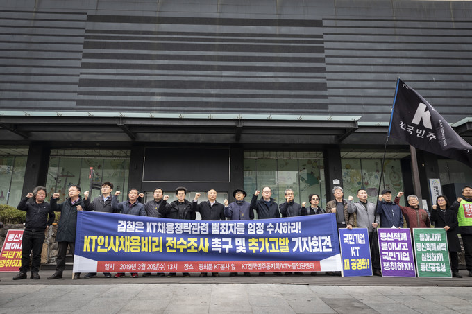 KT민주동지회와 KT노동인권센터가 20일 오후 서울 종로구 광화문 KT 사옥 앞에서 기자회견을 열고 KT 채용비리에 관한 전수조사를 촉구했다.