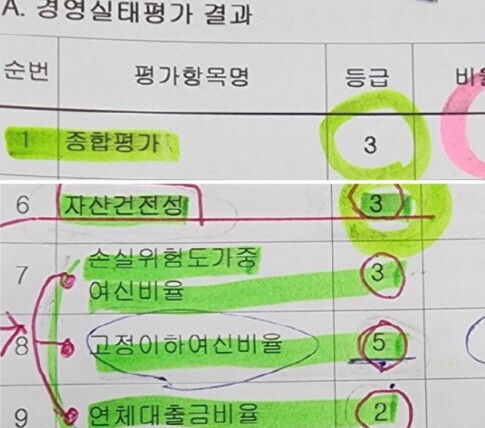 취재진이 물금새마을금고 측으로부터 확보한 자료에 따르면 해당 금고의 중앙회 종합평가는 3등급이다. 세부 지표별로 보면 자산건전성은 3등급, 연체대출금비율 2등급 등이다. 다만 고정이하 여신비율은 5등급이다.