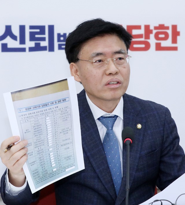 ▲ 지난해 12월27일 오전 서울 여의도 국회에서 열린 자유한국당 청와대 특별감찰반 정권실세 사찰 보고 묵살 및 불법사찰 의혹 진상조사단 회의에서 최교일 의원이 '환경부 산하기관 임원들의 사퇴 등 관련 동향' 문건 복사본을 들고 발언하고 있다. [뉴시스]