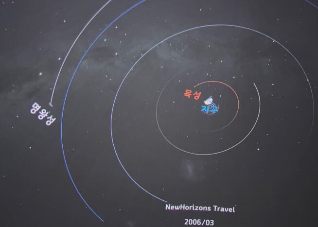 ▲ 아리랑우주천문대 천체투영관에서 직접 구현한 뉴호라이즌호와 태양계 행성들 궤적 [밀양시 제공]