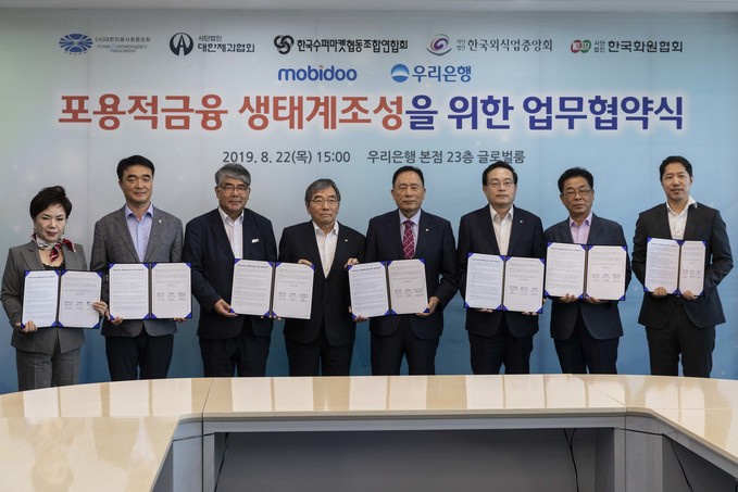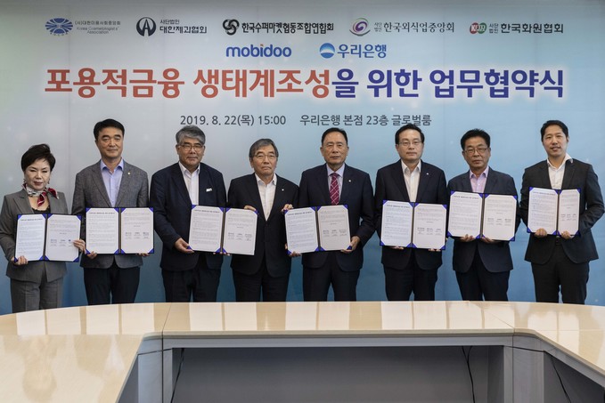 포용적금융 생태계조성을 위한 업무협약식이 22일 오후 서울 중구 우리은행 본점에서 열린 가운데 윤석헌 금융감독원장(왼쪽 네번째), 손태승 우리금융그룹 회장(왼쪽 여섯번째) 등 참석자들이 기념촬영을 하고 있다.