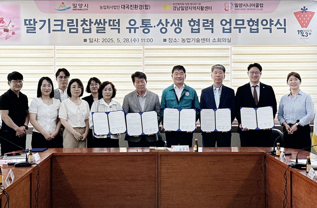 경남 밀양시는 28일 농업기술센터 소회의실에서 지역 대표 농산물을 활용한 딸기크림찹쌀떡의 안정적 생산과 지역 유통 확대를 위한 업무협약식을 개최했다.