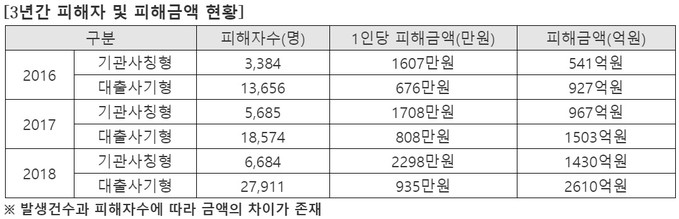 특히 1인당 피해 금액도 △ 2016년 기관사칭형 1607만 원, 대출사기형 676만 원에서 △ 2017년 기관사칭형 1708만 원, 대출사기형 808만 원 △ 2018년 기관사칭형 2298만 원, 대출사기형 935만 원으로 매년 증가했다.