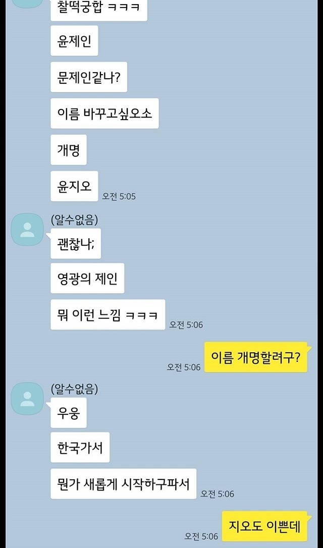 또 다른 대화에서 윤지오 씨는 이름을 바꾸고 싶다며 "윤제인. 문제인 같나?"라고 묻기도 했다. 이어 "개명. 윤지오"라며 "괜찮나. 영광의 제인. 뭐 이런 느낌"이라고 언급했다.