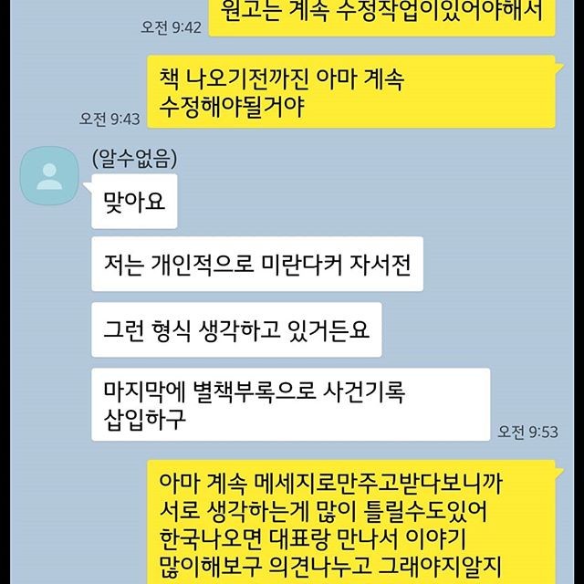 이날 공개된 카톡 대화에서 두 사람은 책 원고 수정에 관해 얘기했고 윤지오 씨는 "저는 개인적으로 미란다 커 자서전"이라며 "그런 형식 생각하고 있거든요. 마지막에 별책부록으로 사건 기록 삽입하고"라고 의견을 제시했다.