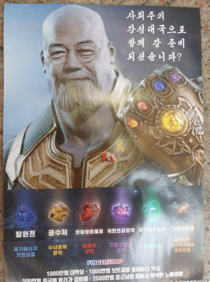 대구지방경찰청에 따르면 이날 백화점 옥상에서 영화 '어벤저스' 절대악 캐릭터인 '타노스'와 문 대통령 얼굴을 합성한 전단지 1000여 장이 뿌려졌다.
