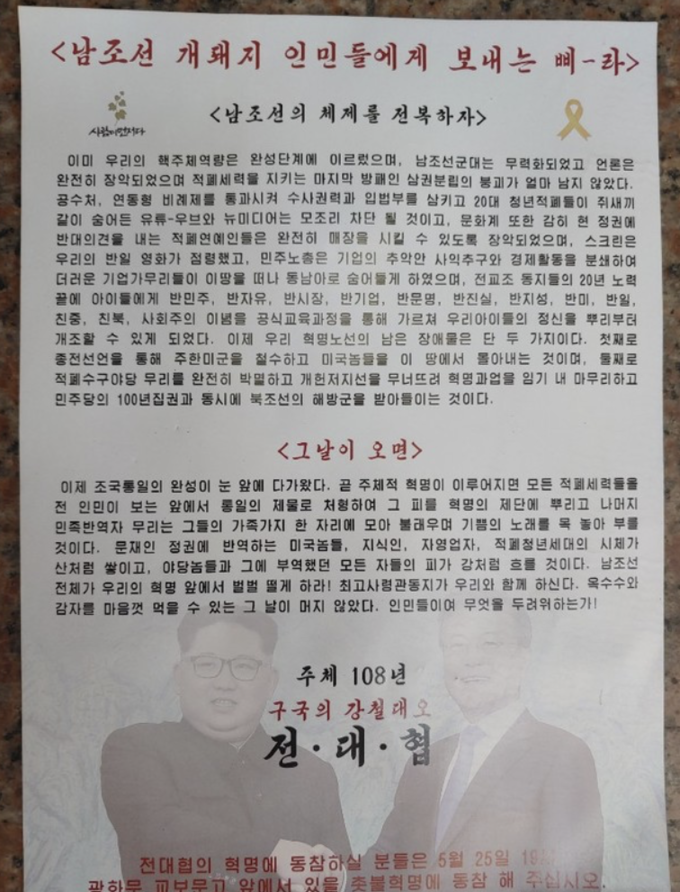 전단지는 북한의 입장을 빌려 국내 현안을 풍자하는 일종의 패러디 형식으로 작성됐다. 전단지 뒷면에는 '남조선 개돼지 인민들에게 보내는 삐-라'라는 제목의 글이 담겼다.