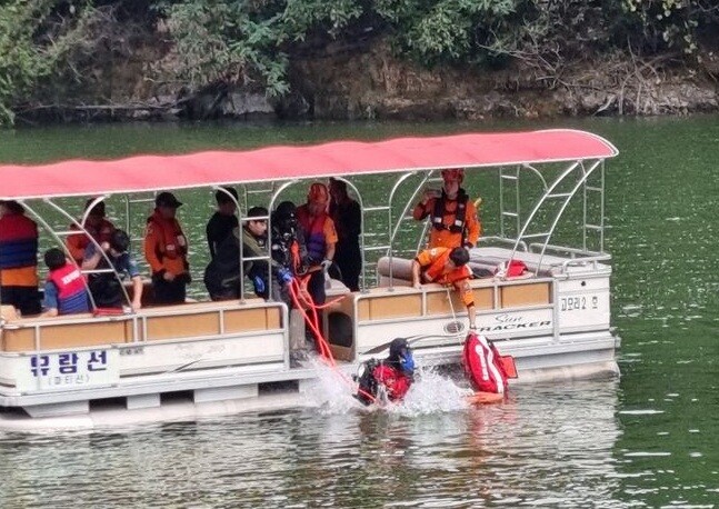 | ▲ 포천 고모리저수지 헬기추락사고 현장에서 잠수요원이 수색작업을 벌이고 있다. [경기북부소방본부 제공] |