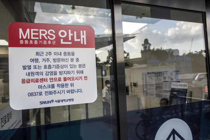 중동호흡기증후군(MERS·메르스) 확진 환자가 3년여만에 발생한 가운데 9일 서울 종로구 서울대학교병원 응급의료센터 앞에 메르스 관련 안내문이 붙어있다. 지난 8일 질병관리본부에 따르면 쿠웨이트를 다녀온 A씨(61)가 메르스 확진 판정을 받아 서울대병원 국가지정격리병상에서 격리 치료를 받고 있다.