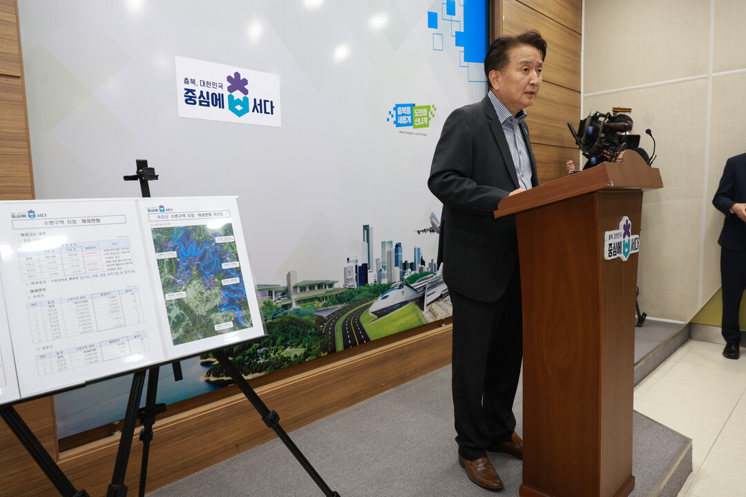 | ▲환경부의 금강수계 수변구역 해제고시를 설명하는 김영환 충북지사.[충북도 제공] |