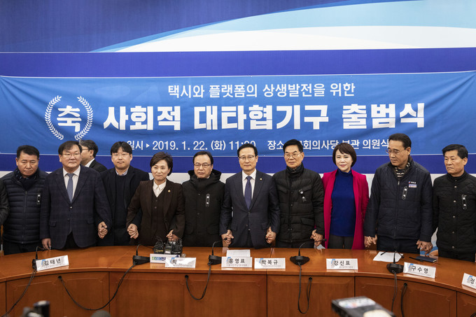 정부는 택시업계와 카풀 업계의 갈등을 풀기 위해 '택시산업 발전과 플랫폼 업계와의 상생 방안을 논의하기 위한 사회적 대타협기구'에서 상생 방안을 모색하겠다는 입장이다. 사회적 대타협기구는 참여를 거부해오던 택시 업계가 지난 1월18일 동참 의사를 밝히면서 같은달 22일 출범했다.