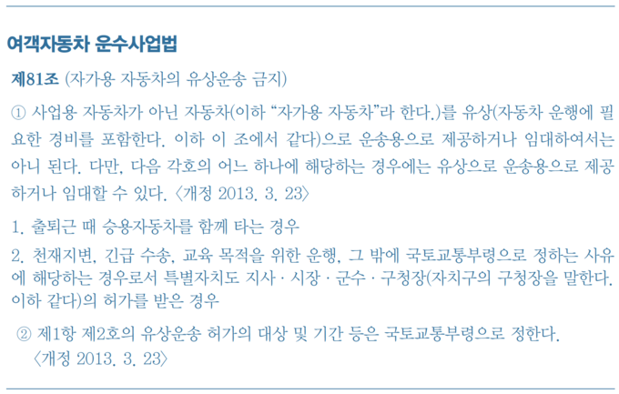 택시업계는 사문화된 예외조항을 근거로 카풀 업체들이 영업을 한다고 말한다. 이용복 팀장은 "입법된 1994년 당시 자가용 함께 타기 운동 등을 통해 유류 절약과 교통량 감소를 정책적으로 시행했다. 출퇴근 때 동네 주민이나 직 장 동료끼리 자가용을 함께 타면서 감사의 표시로 식사를 대접하는 등의 대가가 처벌받을 여지가 있어서 예외조항을 만든 것"이라고 말했다.