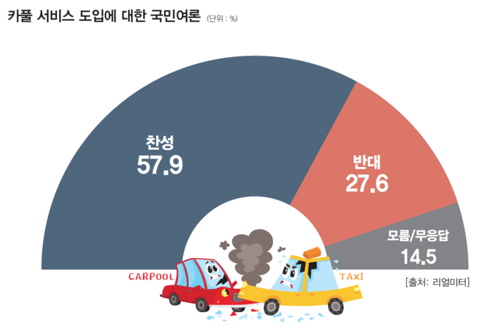 리얼미터가 지난 1월23일 tbs 의뢰로 전국 성인 502명을 대상으로 조사(신뢰수준 95%에 표본오차 4.4%포인트)한 결과, 카풀 도입에 대해 '시민 편익 증진에 도움이 되므로 찬성한다'는 응답이 57.9%, '택시기사의 생존권 보호를 위해 반대한다'는 응답이 27.6%로 각각 집계됐다.
