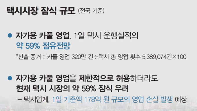 택시업계는 카풀이 제한적으로 시행될 경우에도 택시 시장이 60% 가까이 잠식될 수 있다고 주장한다. 이용복 전국택시운송사업조합연합회 팀장은 "국토교통부가 자가용 카풀 영업을 하루 2회로 제한하고, 카풀업계가 운전자를 200만명 모집한다는 가정 아래 가동률 80%를 적용하면 카풀의 1일 최대 운행 실적이 약 320만건으로, 택시 운행 횟수의 59%를 차지한다"며 "이에 따라 택시업계는 하루에 약 178억원 규모의 영업 손실이 발생하게 된다"고 말했다. "카풀업계가 초창기에 카풀이 택시시장을 잠식하지 않고 새로운 시장을 창출한다고 말했는데, 이는 논리적으로 맞지 않는다"는 것이다.