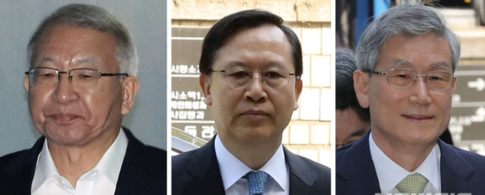 ▲ 양승태 전 대법원장과 박병대·고영한 전 대법관(왼쪽부터)이 29일 오전 서울 서초구 서울중앙지법에서 열린 '사법행정권 남용' 관련 1차 공판에 출석하고 있다. [뉴시스]