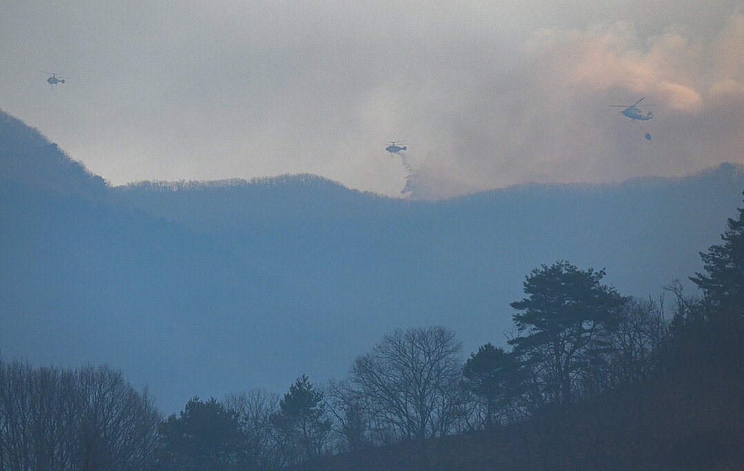 밤사이 1000명이 넘는 인력과 장비 100여 대를 투입해 지상 진화작업에 주력하던 산림당국은 이날 아침부터 총 43대의 헬기를 순차적으로 투입해 공중 진화작업에 총력전을 펼치고 있다.