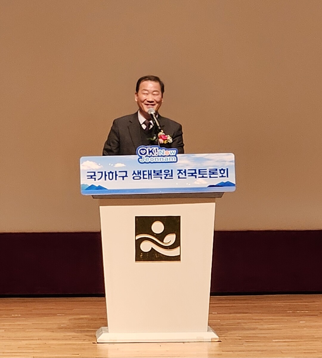 | ▲ 이광일 전남도의회 부의장(더불어민주당·여수1)이 지난 17일 전남도 김대중 강당에서 열린 '국가 하구 생태복원 전국토론회'에 참석해 영산강 하구의 생태복원과 자연성 회복의 중요성을 강조하고 있다. [전남도의회 제공] |